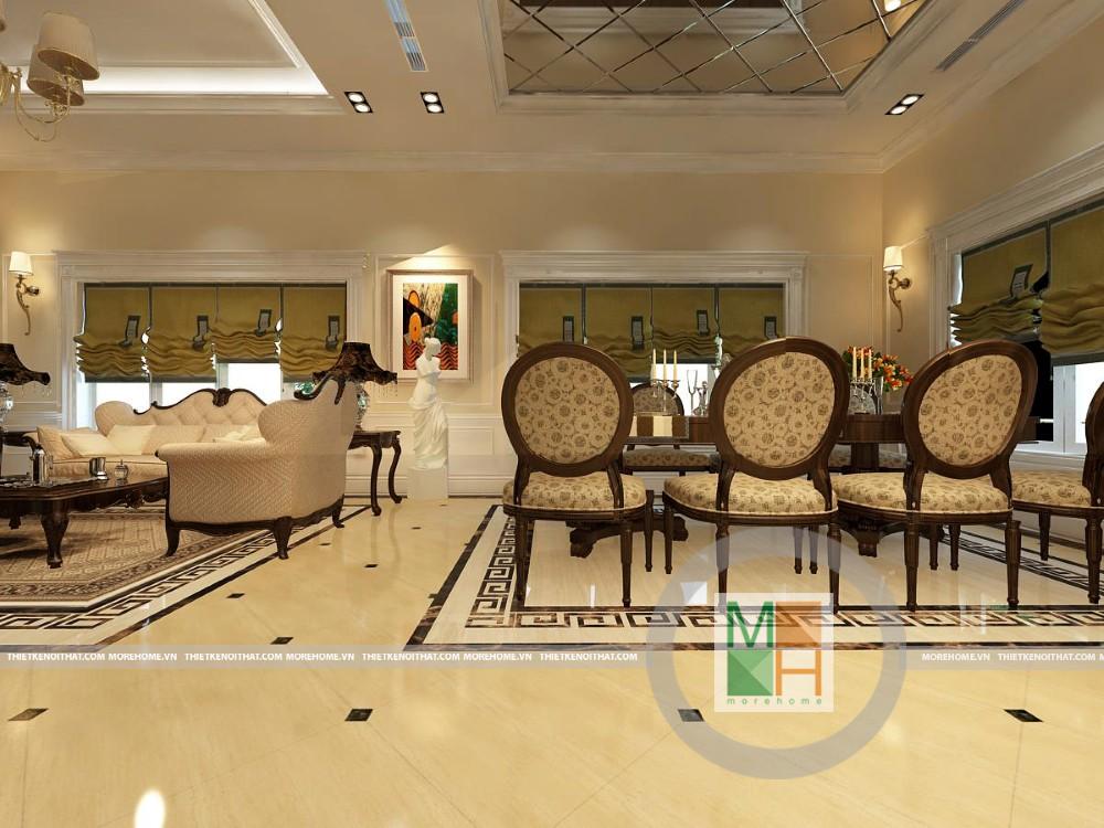 Bộ bàn ghế của gian bếp được thiết kế tương phản đen trắng khiến cho chúng ta có một cảm giác rất sạch sẽ và sang trọng. Diện tích lớn nên việc bố trí bàn ăn và khu bếp nấu cũng rất thoải mái và tạo được một không gian vô cùng rộng thoáng. Mỗi một gian phòng đều được lát một kiểu gạch riêng, tạo những điểm nhấn riêng cho từng vị trí trong nhà mà không hề bị rối mắt. Cửa sổ lớn, hướng sáng khiến cho căn phòng luôn đầy đủ ánh sáng tự nhiên.