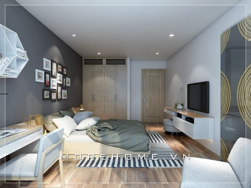 Sắp xếp phòng ngủ nhỏ hợp lí, toàn bộ nội thất không cần thiết được lược bỏ tạo nên sự rộng rãi, thông thoáng hơn cho căn phòng