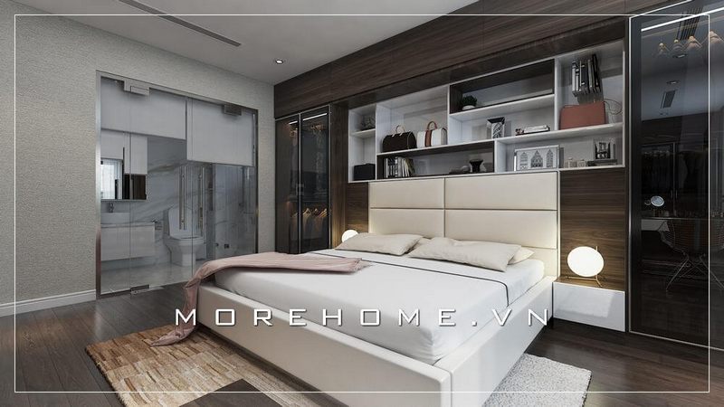 Thiết kế nội thất phòng ngủ hiện đại, sàn gỗ màu nâu trầm chủ đạo tạo cảm giác ấm cúng và thoải mái hơn