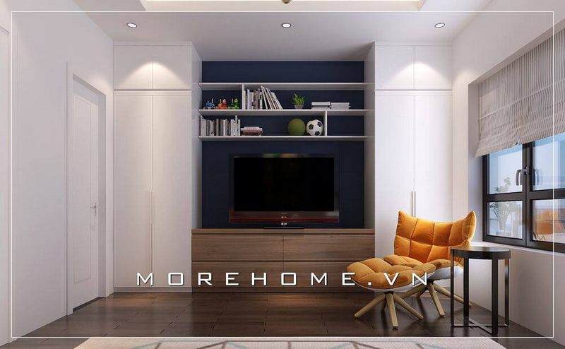 Nội thất phòng ngủ bé trai đầy ấn tượng, toàn bộ nội thất từ giường, kệ tủ, bàn học cho đến rèm cửa đều có màu sắc tươi sáng, sàn gỗ màu nâu ấm tôn lên cả không gian của cả căn phòng