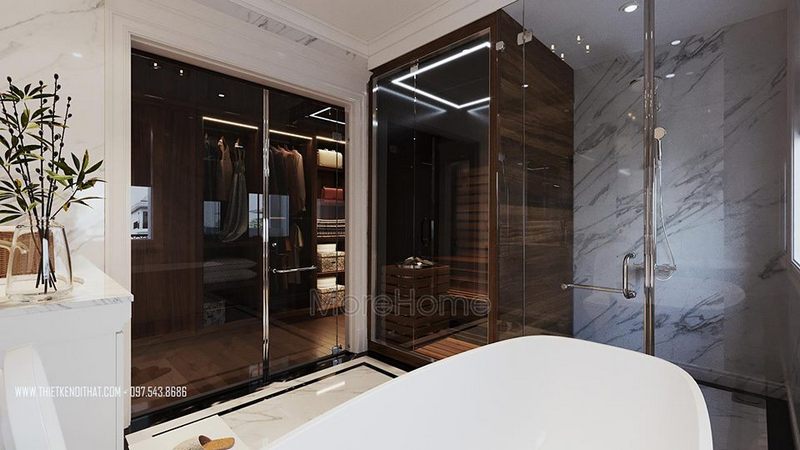 Không gian phòng tắm trang trí kết hợp có phòng xông hơi mang tới cho người dùng nhiều tiện ích.