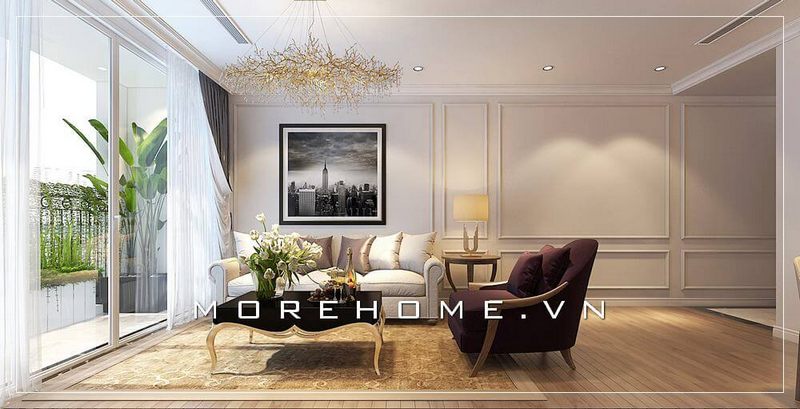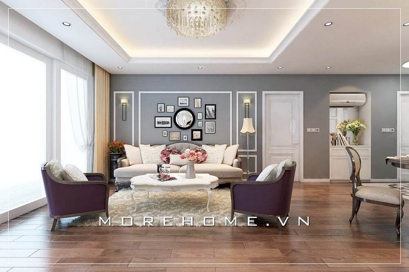 Bộ sofa đơn ấn tượng bằng khung gỗ tự nhiên với thiết kế bọc vải màu tím kiểu dáng tân cổ điển tạo không gian phòng khách thư giãn