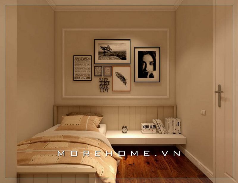 Phòng ngủ của một người hiện đại được trang trí đơn giản bằng một chiếc giường đơn có tab đầu giường tiện lợi.