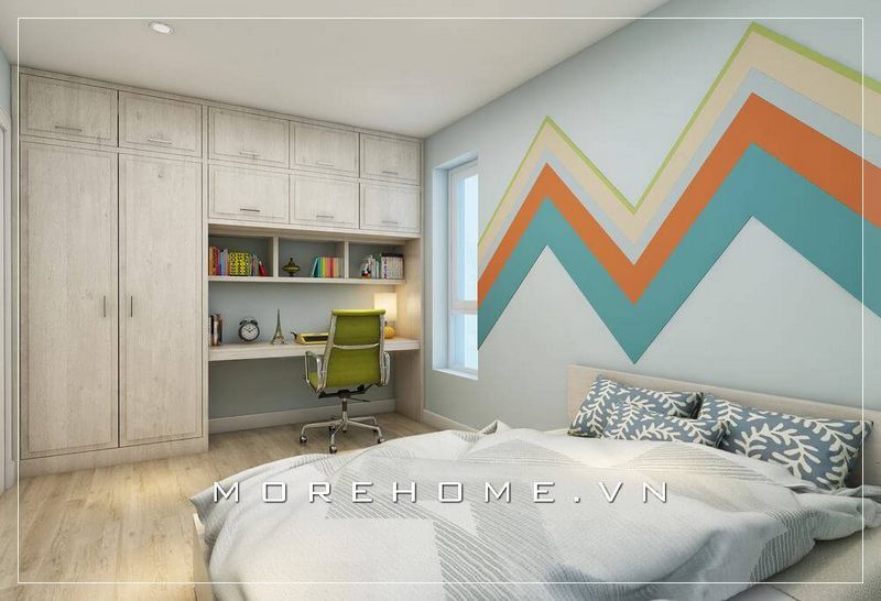 Nội thất phòng ngủ bé trai hiện đại, gọn gàng, chiếc tủ quần áo đa năng tích hợp kệ cách và bàn học giúp con cảm thấy thoải mái và tập trung hơn