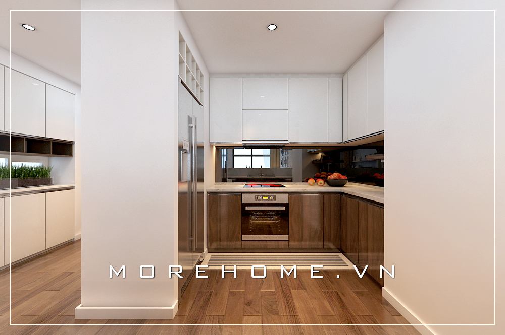 Thiết kế phòng bếp chung cư theo phong cách hiện đại, nội thất gỗ công nghiệp đơn giản và tiện nghi cho nhà chung cư