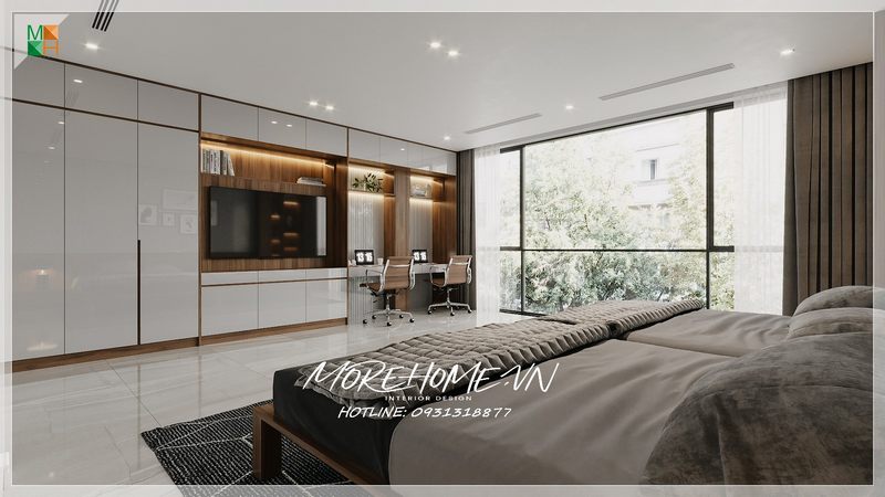 Thiết kế phòng ngủ với mảng tường kính lớn thoáng đãng, hiện đại cho một không gian thư giãn thoải mái, gần gũi phù hợp cho không gian biệt thự.